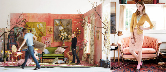 The sofa immediately reminded me of the one in the J. Crew ad. I never like pale pink things because of their color – only despite it – and in this case I think it's that cluttered, vintagey English-countryside feel that makes me like these images. In my craigslisted take on the idea, I paired it with a textured rug and a perfectly beaten-up printer's cabinet to balance out the glitter of the elegant lamp and the sofa's prim and proper girliness*.