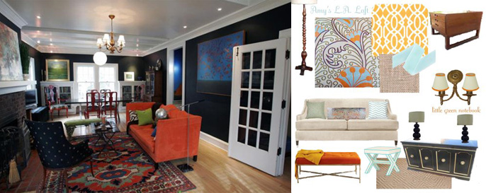 The polka dot wing chair pictured above has been saved to my files for ages, and this rug appears to be its long-lost twin. In the fun, eclectic spirit of the chair and the above rooms, I pulled together a mix of cheap accents anchored by a beautiful couch (an extinct Room and Board product that looks like a non-tufted version of the Hutton, whose picture I used here). The orange chair offers a nice burst of color against the rug, and the "oversized" mirror will love great above the couch. Although the lamps don't come with shades, they're inexpensive enough to be worth a trip to Target for some cheap drum shades. And I saved my favorite for last: the ($35!) set of brass bamboo** nesting tables, which I implore you not to buy; I'm in the process of convincing the boyfriend that a certain corner of our living room is not complete without them!