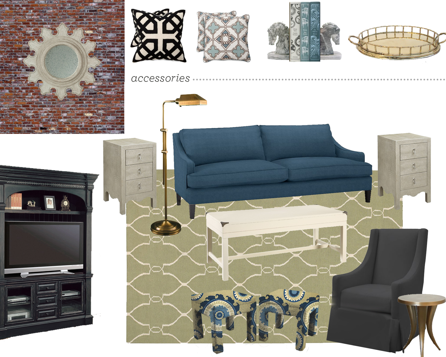 - A design board with all necessary furniture and some accessories. For some examples, see below. These examples represent a variety of styles and price points.